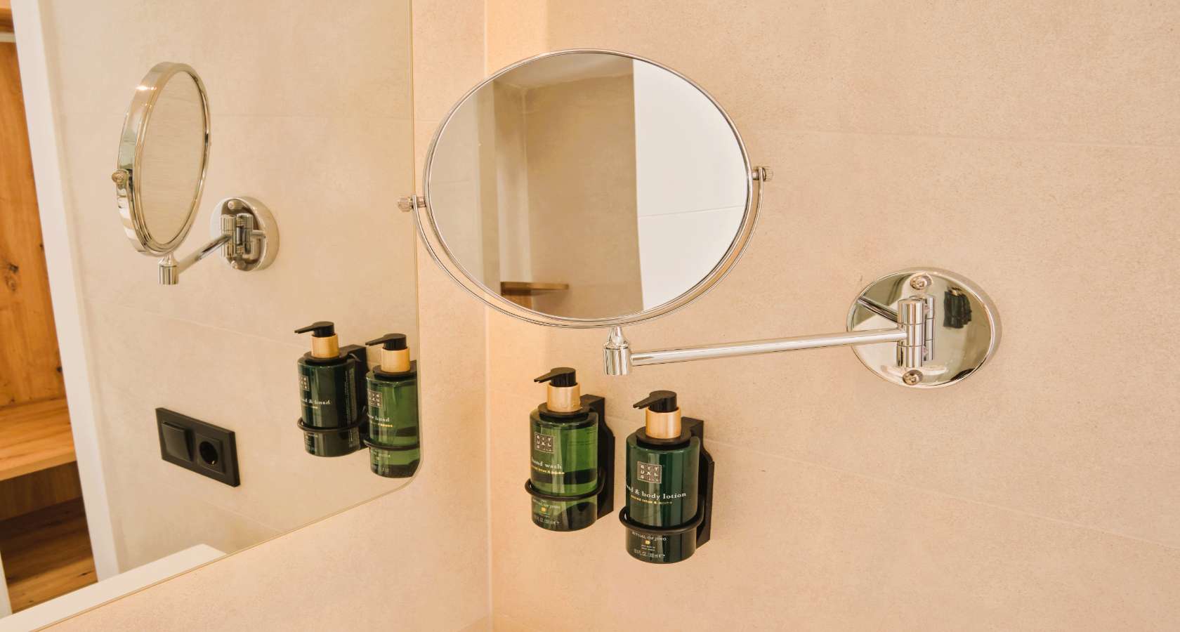 - Badezimmer zugänglich vom Wohnzimmer mit ebenerdiger Dusche, Föhn und Rituals-Pflegeprodukten