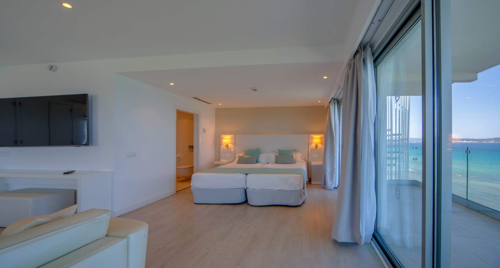 Exclusive Royal Suite on the top floor featuring spectacular front sea views, two bedrooms and a large balcony — ideal for families or guests travelling together.