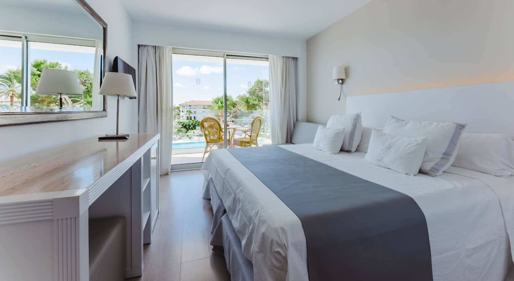 Las habitaciones dobles vista mar lateral se encuentran entre las plantas 1 y 3 del edificio Hotel y tienen capacidad para 1 o 2 adultos; 2 adultos + 1 niño (hasta 14 años). Bebes cuentan como persona. Disponen de sofá cama ó posibilidad de cuna. Son muy luminosas y permiten disfrutar de unas vistas laterales al mar desde su terraza o balcón. Camas: 2 camas (90x200 cm)/ twinbed/ sofá cama (80x180 cm) para el niño y un baño con ducha a ras de suelo.